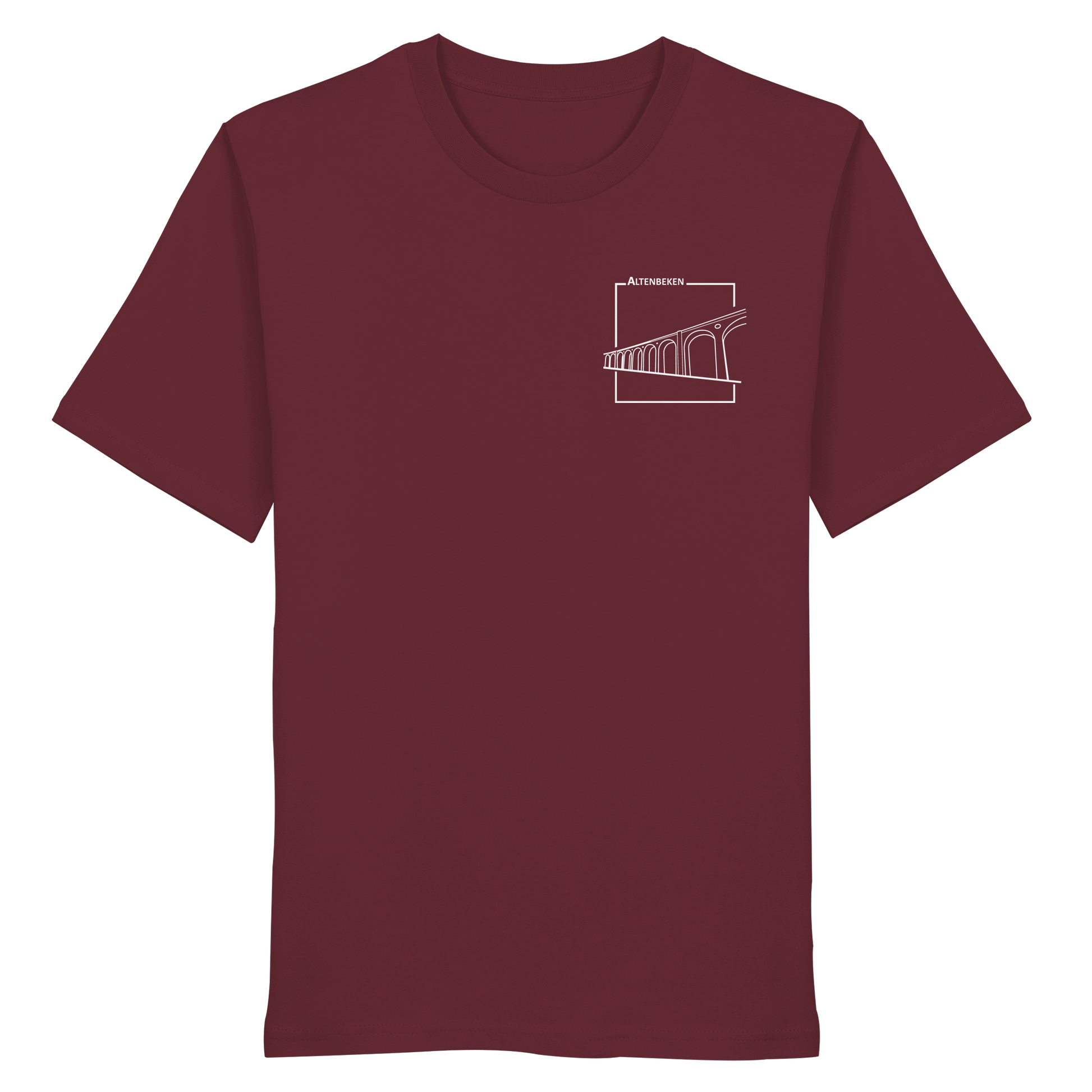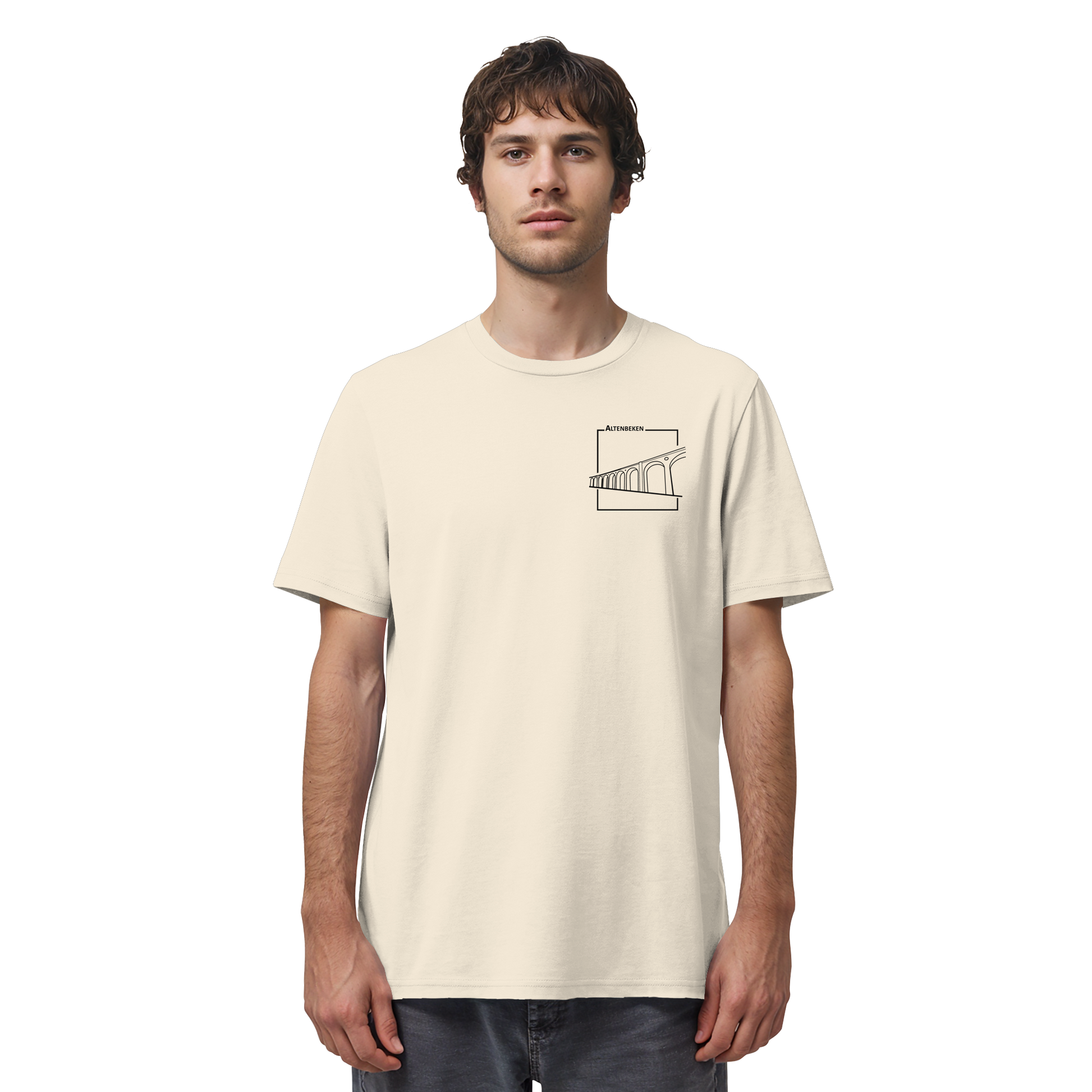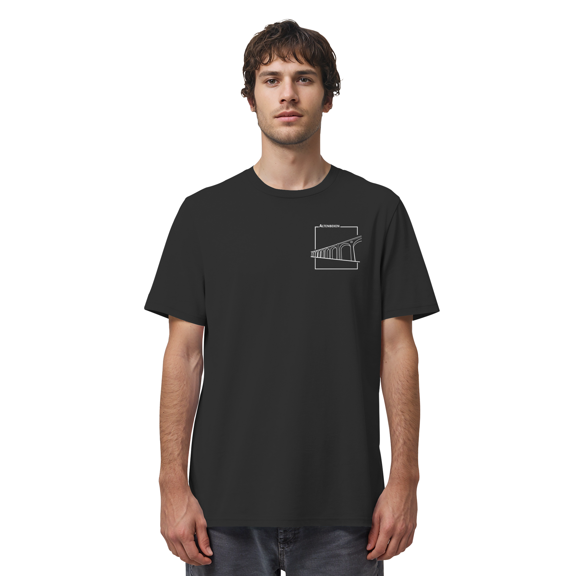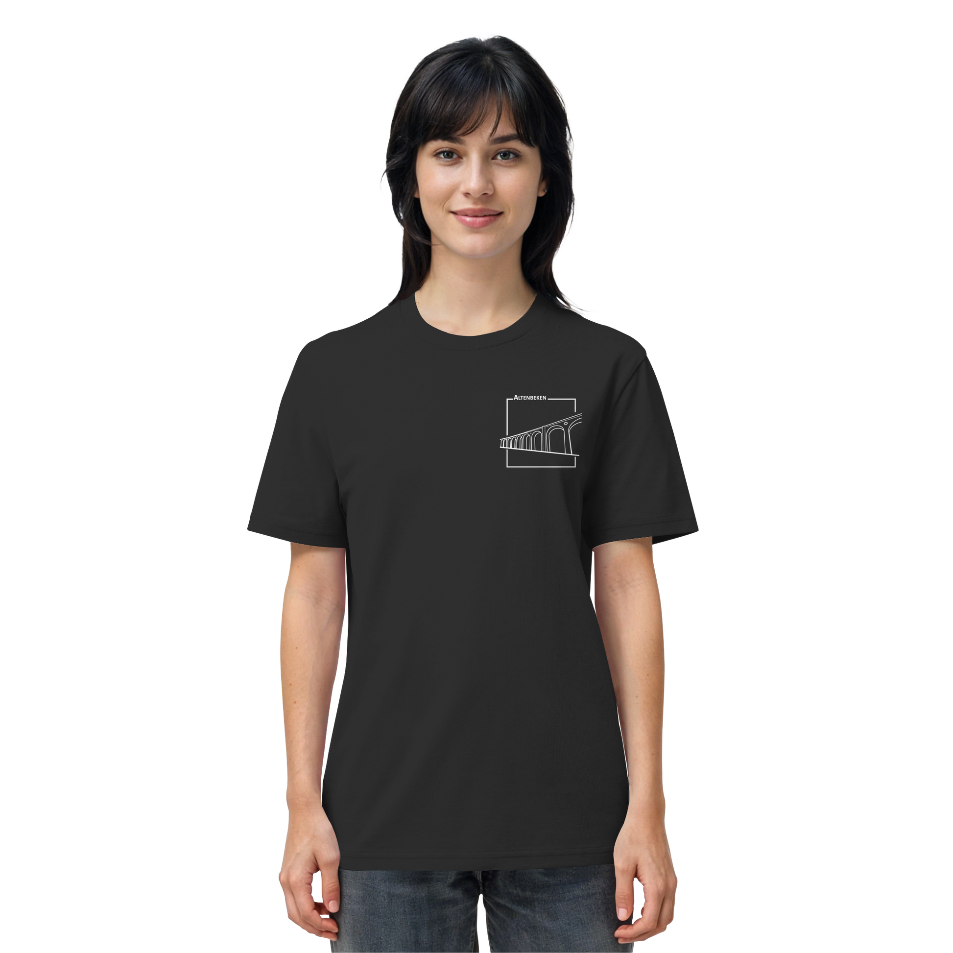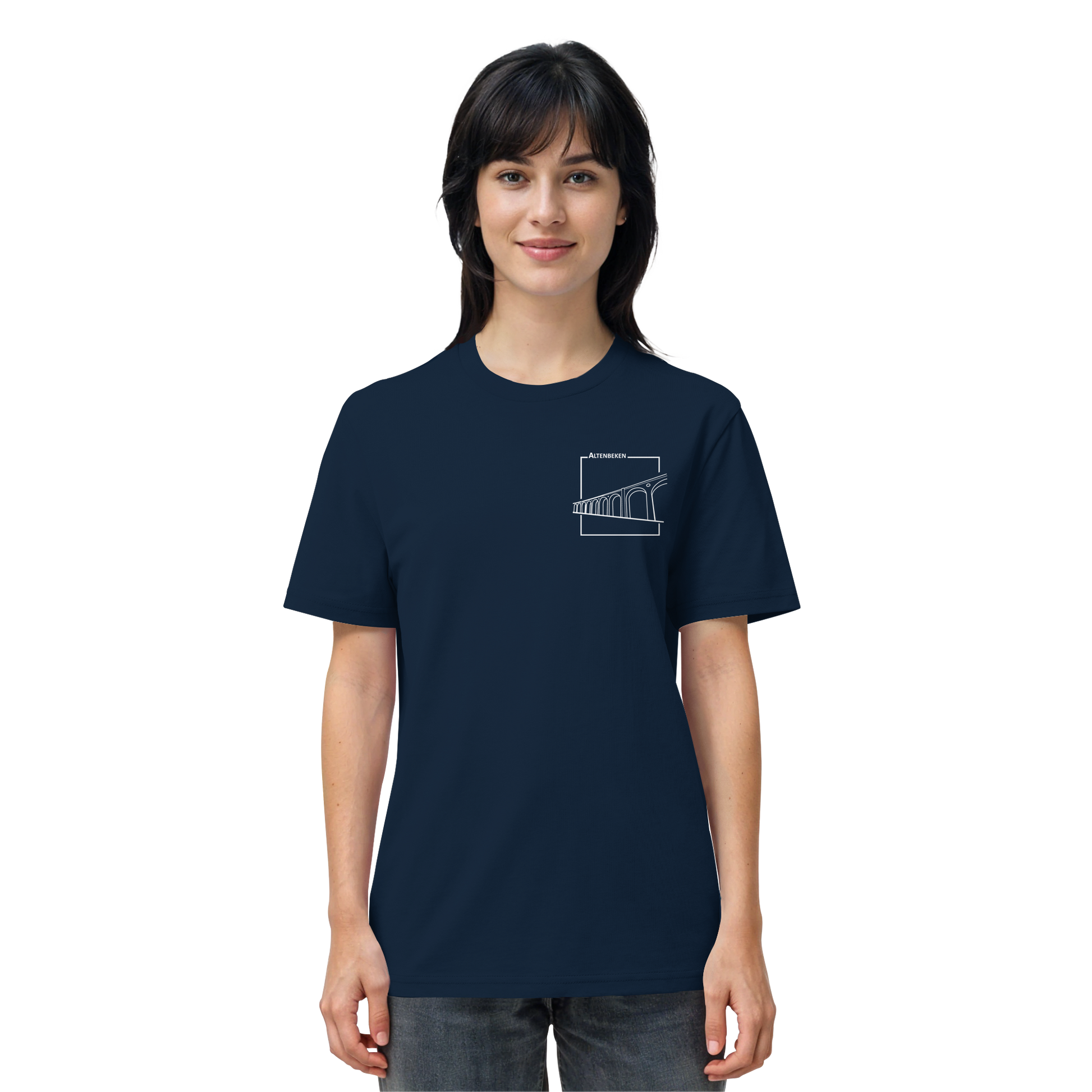 Hier bekommt unser Dorf den Rahmen, den es verdient. Dieses Design ist die perfekte Balance: Es ist präsent genug, um sofort erkannt zu werden, aber grafisch so reduziert, dass es pure Ästhetik ausstrahlt. Wir sehen hier nicht einfach nur unser Viadukt – wir sehen eine moderne Interpretation unserer Architektur. Die weißen Linien auf dem dunklen Stoff wirken fast wie eine technische Zeichnung, eingefasst in einen klaren Rahmen.